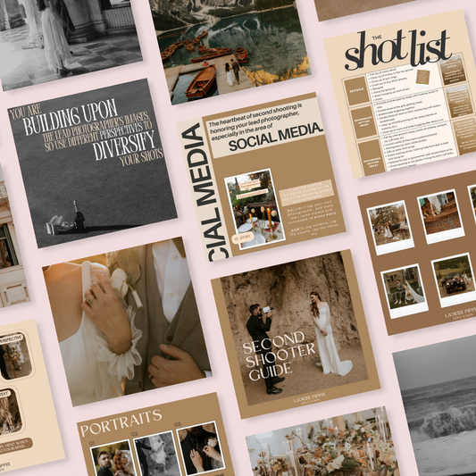 This guide is 34 pages in PDF format and includes information on topics like: your role as a second shooter, etiquette, social media guidelines, creativity, composition, diversifying your shots, packing list, wedding day shot list, camera settings, questions to ask yourself, and more!